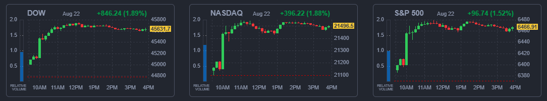 22일(현지시간) 뉴욕증권거래소에서 다우존스30 산업평균지수는 전 거래일 대비 1.89%(846.24포인트) 오른 4만5631.74에 마감했다. 지난해 12월 이후 177거래일 만에 사상 최고치다. 스탠더드앤드푸어스(S&P)500 지수는 1.52% 상승한 6466.91에 마감했고, 기술주 중심의 나스닥 지수도 396.22포인트(1.88%) 뛰어 2만1496.53을 나타냈다.