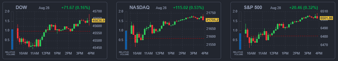 28일(현지시간) 뉴욕증권거래소(NYSE)에서 다우존스30산업평균지수는 전장보다 71.67포인트(0.16%) 오른 4만5636.9에 거래를 마쳤다. S&P500지수는 전장보다 20.46포인트(0.32%) 상승한 6501.86, 나스닥지수는 115.02포인트(0.53%) 뛴 2만1705.16에 마감했다.