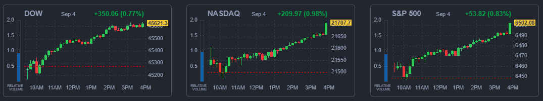 4일(현지시간) 뉴욕증권거래소(NYSE)에서 다우존스30산업평균지수는 전장보다 350.06포인트(0.77%) 오른 4만5621.29에 거래를 마감했다. 스탠더드앤드푸어스(S&P)500지수는 53.82포인트(0.83%) 상승한 6502.08, 기술주 중심의 나스닥종합지수는 209.97포인트(0.98%) 뛴 2만1707.69에 각각 장을 마쳤다. S&P500지수는 4거래일 만에 또다시 사상 최고치를 경신했다.