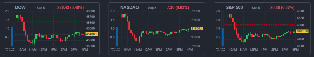 5일(현지시간) 뉴욕증시에서 다우존스30 산업평균지수는 전 거래일보다 220.43포인트(-0.48%) 내린 45,400.86을 기록했다. 스탠더드앤드푸어스(S&P) 500 지수는 같은 기간 20.58포인트(-0.32%) 떨어진 6481.5에, 나스닥 종합지수는 7.31포인트(-0.03%) 하락한 21,700.39에 각각 마감했다.