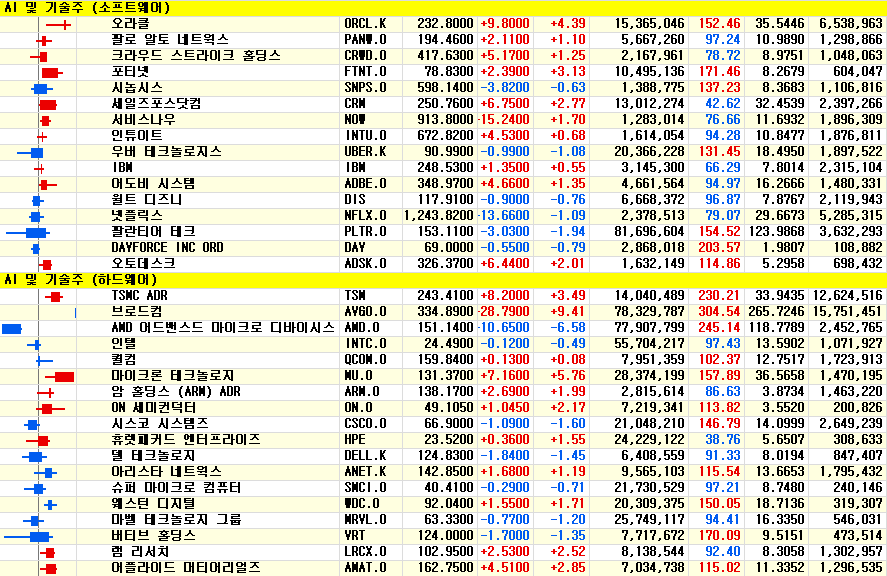 - 브로드컴은 3분기 순이익 41억4000만달러, 주당순이익(EPS) 0.85달러를 기록하며 전년동기 18억8000만달러 순손실에서 흑자 전환했다. 매출은 174억달러로 전년동기 대비 22% 증가하며 시장예상치 170억2000만달러를 웃돌았다.