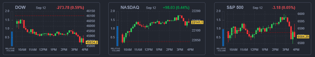 12일(현지시간) 뉴욕증권거래소(NYSE)에서 다우존스30산업평균지수는 전장보다 273.78포인트(0.59%) 내린 4만5834.22에 거래를 마감했다. 스탠더드앤드푸어스(S&P)500지수는 전장보다 3.18포인트(0.05%) 밀린 6584.29에 나스닥 지수는 93.03포인트(0.44%) 상승한 2만2141.10에 장을 마쳤다. 나스닥은 사상 최고 릴레이를 이날까지 닷새째 이어갔다.