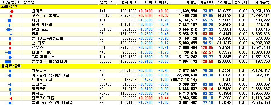 장 초반 증시는 전날 발표된 8월 미국 소비자물가지수(CPI) 결과(전년 동월 대비 2.9% 상승)를 소화하며 보합권에서 움직였다.. 그러나 미국 소비자의 경제 신뢰도를 반영하는 소비자심리지수 예비치가 55.4로, 전달(58.2) 대비 2.8%포인트(4.8%) 하락하고, 시장 전망치(58)을 밑돌자, 경기 변화에 민감한 경기순환주 위주로 투자심리가 위축됐다. 반면 대형 기술주는 강세를 보였다.