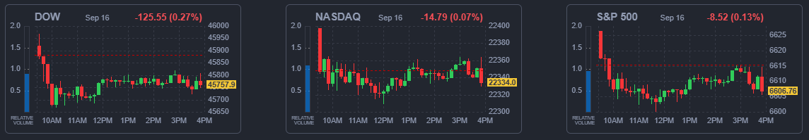 16일(현지시간) 뉴욕증권거래소(NYSE)에서 다우존스30산업평균지수는 전일 대비 125.55포인트(0.27%) 내린 45,757.90에, 스탠더드앤드푸어스(S&P)500지수는 8.52포인트(0.13%) 밀린 6,606.76에, 나스닥종합지수는 14.79포인트(0.07%) 하락한 22,333.96에 각각 마감됐다.