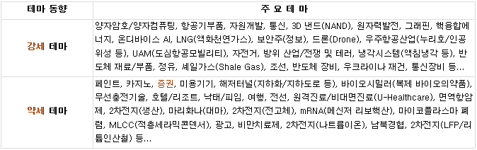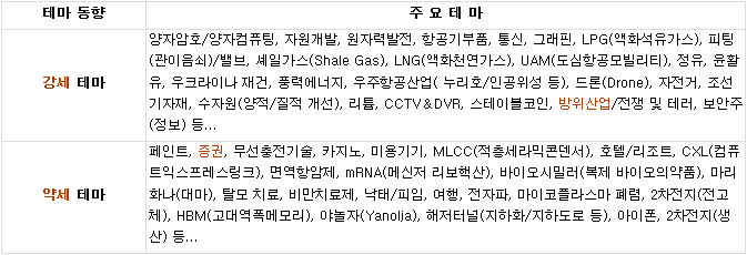 ■ 방위산업/전쟁 및 테러 - 트럼프 대통령, NATO에 무기 지속 공급 시사 및 러시아 항공기 NATO 영공 진입시 격추 발언 등에 일부 관련주 상승