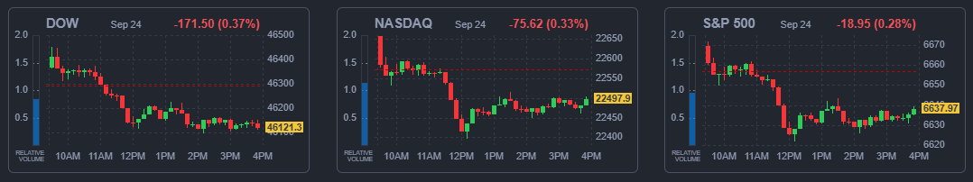 25일 금융투자업계에 따르면 24일(미국 동부시간) 뉴욕증권거래소(NYSE)에서 장 마감 무렵 다우존스30산업평균지수는 전장보다 171.50포인트(0.37%) 내린 4만6121.28에 거래를 마감했다. 스탠더드앤드푸어스(S&P)500지수는 전장보다 18.95포인트(0.28%) 밀린 6637.97, 나스닥종합지수는 75.62포인트(0.33%) 떨어진 2만2497.86에 장을 마쳤다.