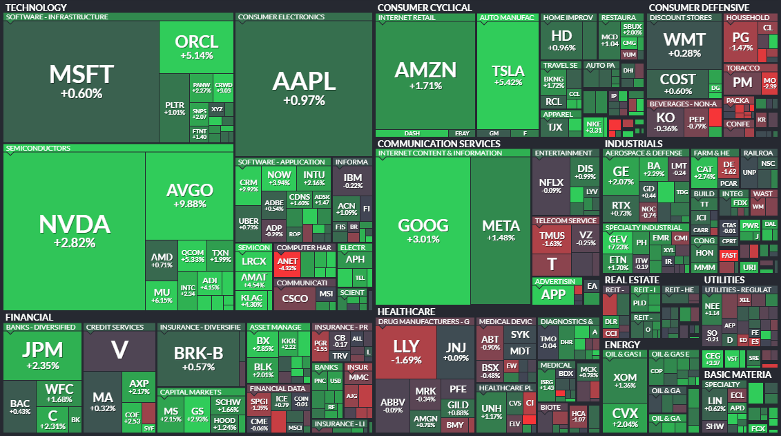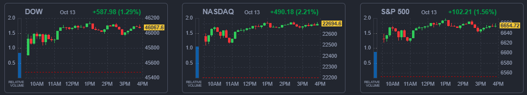 13일(현지시간) 뉴욕증권거래소(NYSE)에서 다우존스30산업평균지수는 전장보다 587.98(1.29%) 오른 4만6067.58에 거래를 마쳤다. 스탠더드앤드푸어스(S&P)500지수는 102.21포인트(1.56%) 상승한 6654.72에, 기술주 중심의 나스닥종합지수는 490.18포인트(2.21%) 뛴 2만2694.61에 각각 마감했다.