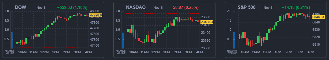 미국 뉴욕 증시의 3대 지수가 11일(현지시간) 혼조세로 마감했다. 연방정부 셧다운(Shut Down·일시적 업무정지) 해제가 초읽기에 들어가면서 투자심리가 되살아난 영향이다. 다만 밸류에이션(평가가치) 부담에 따른 인공지능(AI) 관련주 하락과 부진한 고용 지표가 상승세를 제한했다.