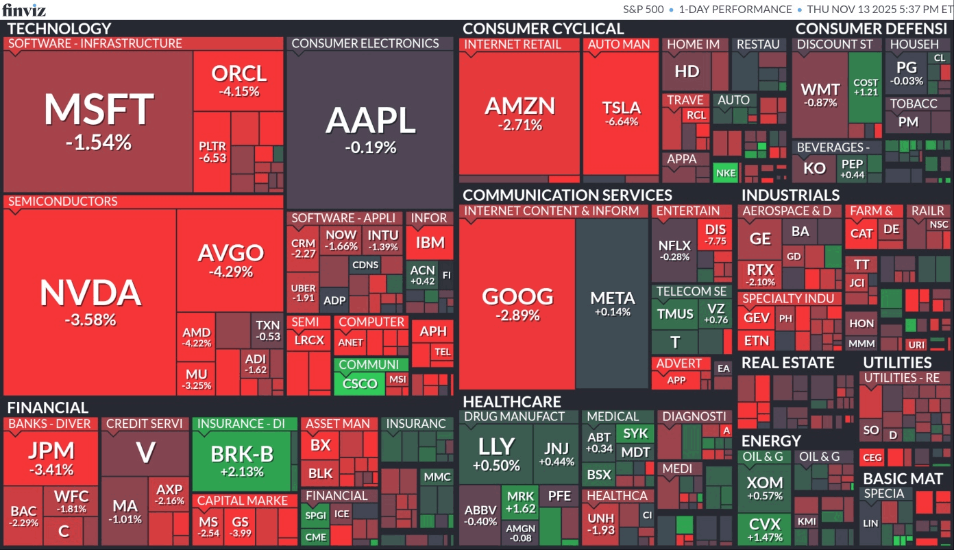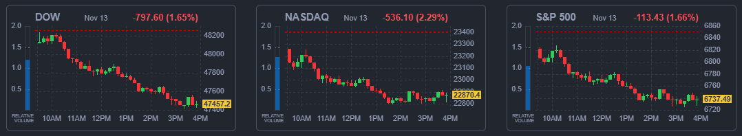 13일(현지 시간) 뉴욕증시 주요 지수가 일제히 급락 마감했다. 기술주 매도세가 심화하고 금리 전망에 대한 비관론이 커지면서 한 달여 만에 최악의 하루를 보냈다.