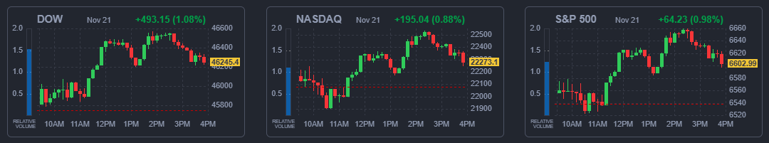 21일(현지시간) 뉴욕증권거래소(NYSE)에서 장 마감 무렵 다우존스30산업평균지수는 전장보다 493.15포인트(1.08%) 올라간 46,245.41에 거래를 마쳤다. 스탠더드앤드푸어스(S&P) 500지수는 전장보다 64.23포인트(0.98%) 상승한 6,602.99, 나스닥 종합지수는 195.03포인트(0.88%) 오른 22,273.08에 장을 마감했다.