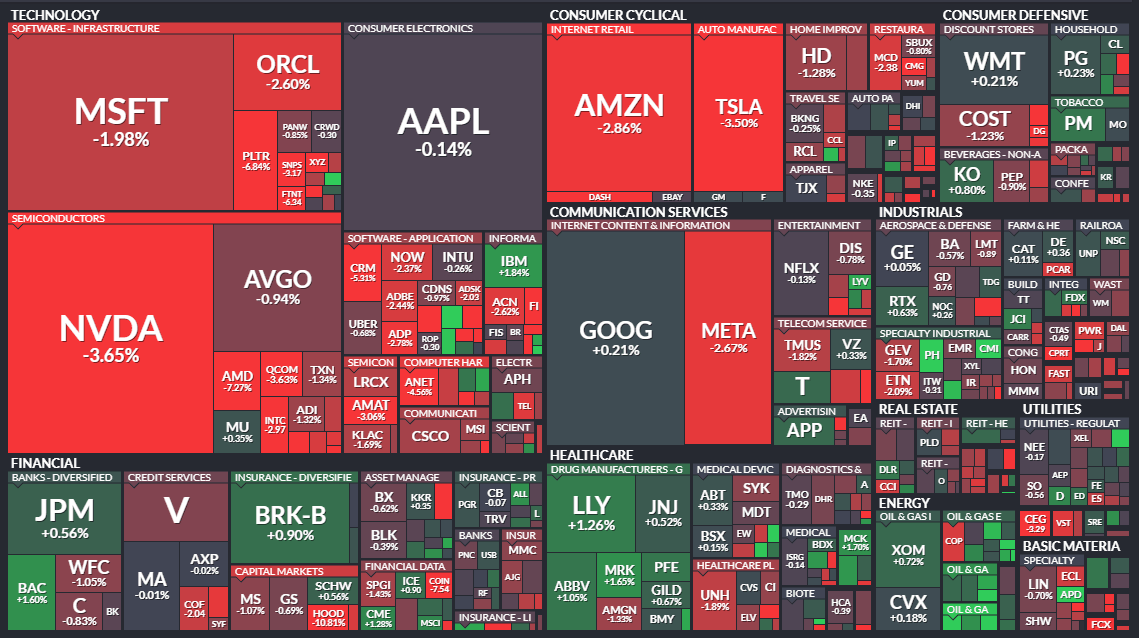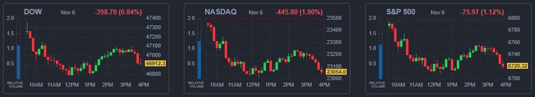 6일(현지시간) 뉴욕증권거래소(NYSE)에서 다우존스30산업평균지수는 전 거래일 대비 398.7포인트(0.84%) 하락한 46,912.3에 거래를 마감했다. 스탠더드앤드푸어스(S&P)500지수는 전일 대비 75.97포인트(1.12%) 밀린 6720.32에 나스닥종합지수는 445.8포인트(1.9%) 급락한 2만3053.99에 장을 마쳤다.