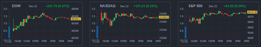 미국 뉴욕 증시 3대 지수가 22일(현지시간) 일제히 상승 마감했다. 연말 연휴를 앞두고 기술주 중심으로 저가 매수 흐름이 나타나며 '산타 랠리'에 대한 기대감이 높아졌다.