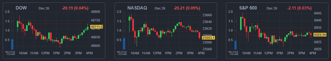 미국 뉴욕 증시는 26일(현지시각) 거래가 극히 한산한 가운데 주가가 소폭 하락했다. 기관투자가들은 올해 거래를 대부분 마무리한 상태다. 이날 거래량은 약 15억 주로 이는 평소 거래량의 약 3분의 1 수준이다.