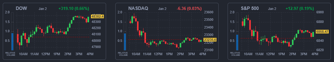 2일(현지시간) 뉴욕증권거래소(NYSE)에서 다우존스30산업평균지수는 전 거래일보다 319.10포인트(0.66%) 오른 48,382.39을 기록했다. 스탠더드앤드푸어스(S&P) 500지수는 같은 기간 12.97포인트(0.19%) 상승한 6858.47, 나스닥종합지수는 6.36포인트(0.03%) 내린 23,235.63에 장을 마쳤다.