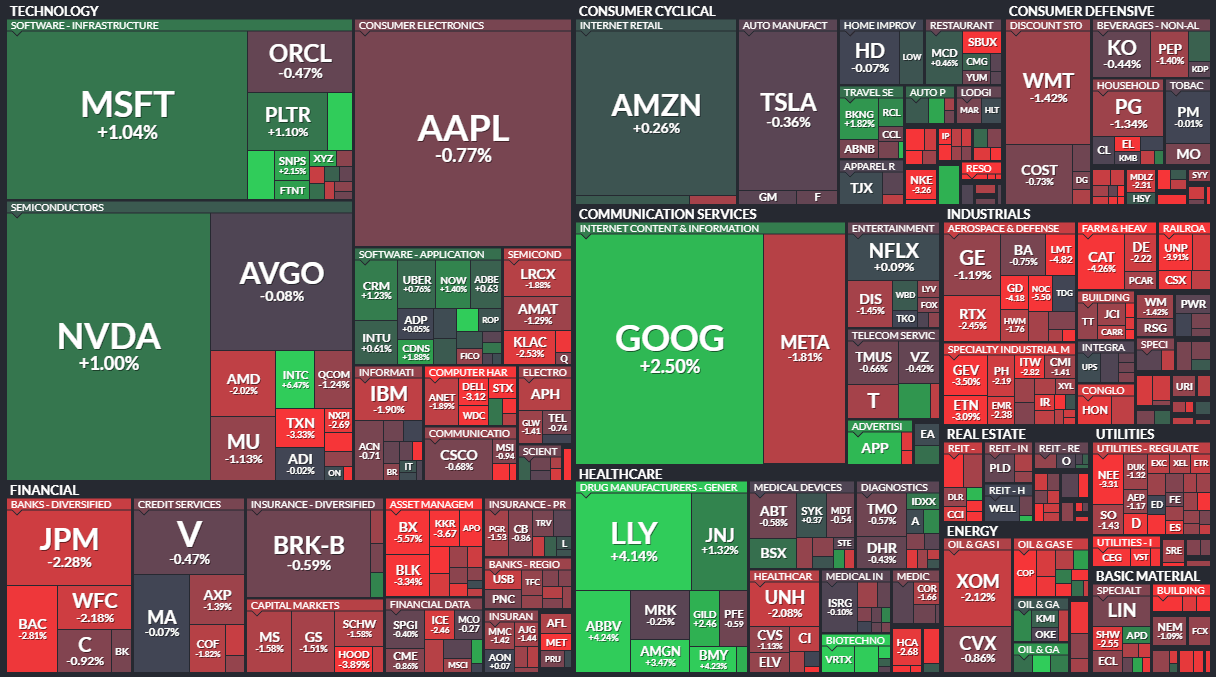 이날 뉴욕 주식시장에서 블루칩 중심의 다우지수는 전 거래일보다 466포인트(0.94%) 하락한 4만8996.08에 장을 마쳤다. 대형주 중심의 S&P500지수는 23.89포인트(0.34%) 내린 6920.93, 기술주 중심의 나스닥지수는 37.102포인트(0.16%) 오른 2만3584.275에 거래를 마감했다.