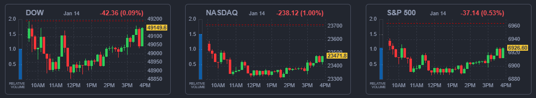 뉴욕증시는 14일(현지 시간) 이란 반정부 시위 등 지정학적 위기와 도널드 트럼프 미국 행정부의 상호 관세 불확실성 여파로 하락 마감했다.