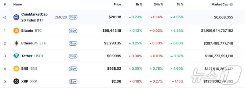 암호화폐 대부분 하락, 비트 9.5만달러 붕괴-리플 0.27%↓