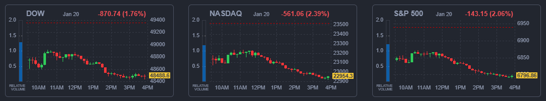 20일(이하 현지시간) 뉴욕증권거래소(NYSE)에서 다우존스30산업평균지수는 전 거래일 대비 1.76% 내린 4만8488.59에 장을 마감했다. 스탠더드앤드푸어스(S&P)500지수는 2.06% 급락한 6796.86에, 기술주 중심의 나스닥지수는 2.39% 떨어진 2만2954.32에 거래를 마쳤다.