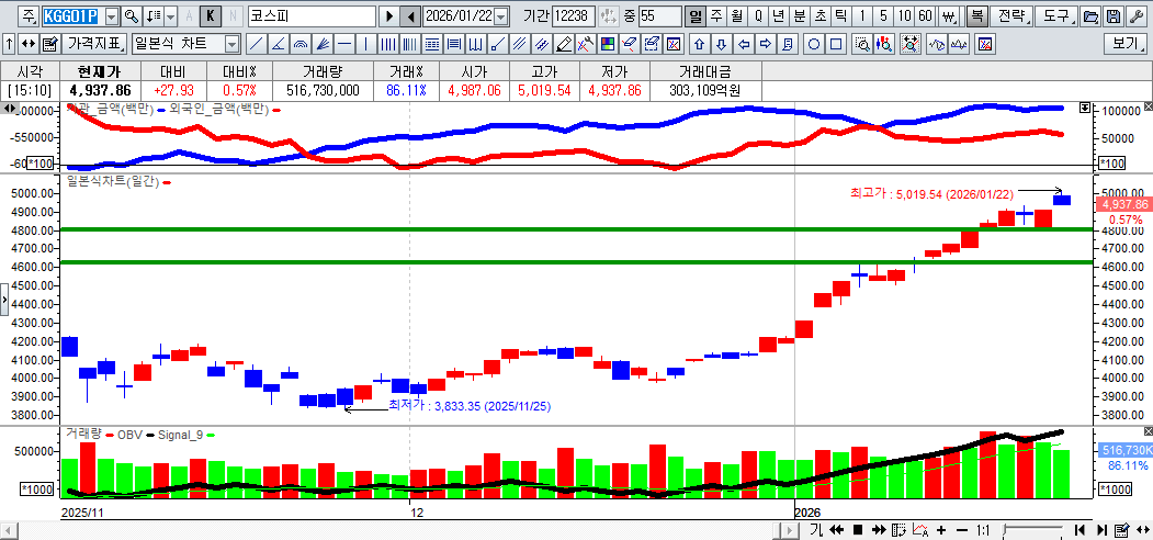 ▷지난밤 뉴욕증시가 트럼프 대통령, '그린란드 관세' 철회 등에 상승한 가운데, 이날 국내증시도 상승세를 기록중. 특히, 코스피지수는 장중 사상 처음으로 5,000선을 돌파했음. 21일(현지시간) 트럼프 대통령은 자신의 트루스소셜 계정을 통해 "마크 뤼터 북대서양조약기구(NATO·나토) 사무총장과 매우 생산적인 회담을 가진 결과 그린란드와 북극 지역 전체에 대한 미래 협정의 틀을 마련했다"며 "유럽 8개국에 2월 1일부터 시행될 예정이던 관세를 부과하지 않을 것"이라고 밝혔음. 이에 증권가에서는 미국과 유럽이 강대강 국면에서 협상 모드로 전환한 점이 긍정적이라는 의견이 제기.