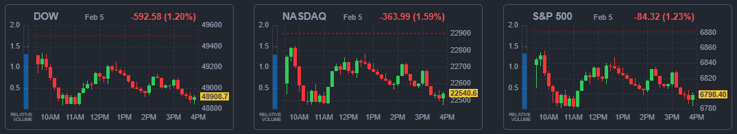 5일(현지시간) 뉴욕증권거래소(NYSE)에서 다우존스30산업평균지수는 전장 대비 592.58포인트(1.2%) 하락한 4만8908.72에 마감했다. 스탠더드앤드푸어스(S&P)500지수는 전일 대비 84.32포인트(1.23%) 떨어진 6798.4에 나스닥지수는 363.99포인트(1.59%) 낮은 2만2540.59에 장을 마쳤다.