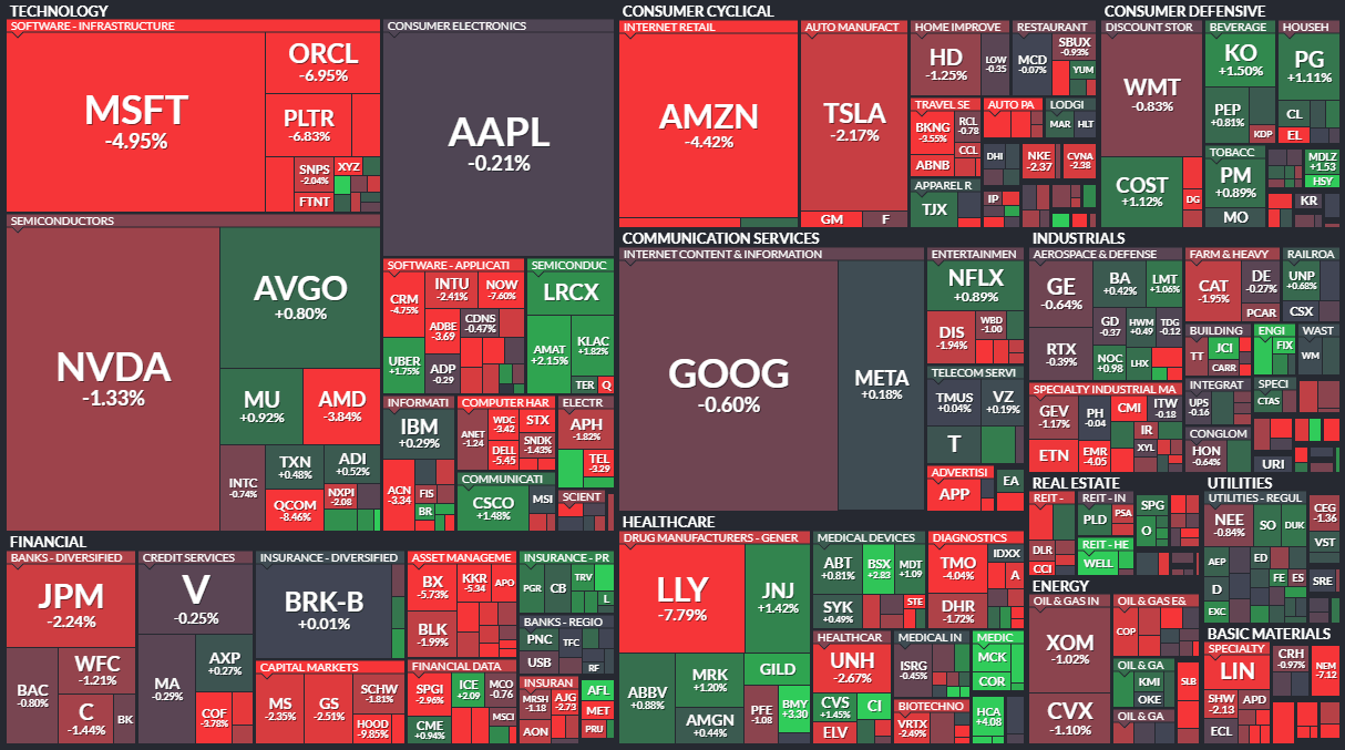 - 기대에 미치지 못하는 분기 실적과 예상보다 높은 자본 지출을 보고한 후 8% 하락했습니다. 아마존은 2026년에 약 2,000억 달러의 자본 지출을 투자할 것으로 예상한다고 발표했습니다. 이 수치는 분석가들의 예상치인 1,461억 1,000만 달러를 초과합니다.