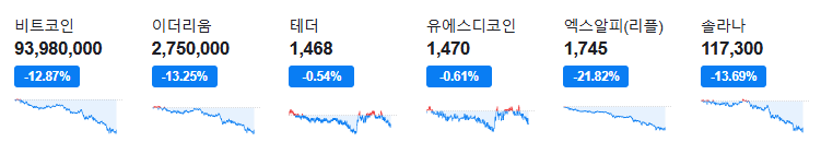 비트코인도 약세를 보이고 있다. 코인마켓캡에 따르면 비트코인은 24시간 전 대비 12% 하락한 6만3000달러선에서 거래되고 있다.