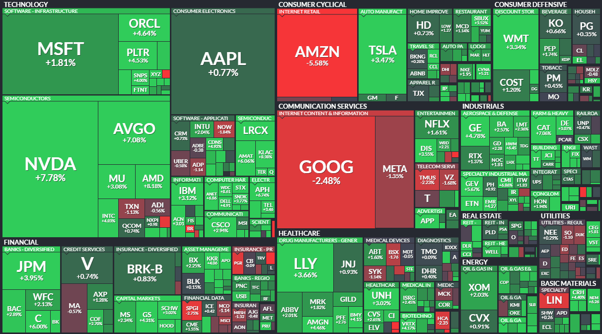 미국의 7대 기술주는 최근 시장의 예상에 못 미치는 실적을 발표한 아마존과 알파벳을 제외하고 엔비디아가 8% 정도 급등하는 등 일제히 랠리했다.