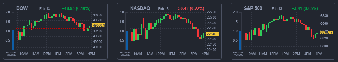 13일(미국 동부시간) 뉴욕증권거래소(NYSE)에서 다우존스30산업평균지수는 전장보다 48.95포인트(0.10%) 오른 49,500.93에 장을 마쳤다. 스탠더드앤드푸어스(S&P) 500지수는 전장보다 3.41포인트(0.05%) 상승한 6,836.17, 나스닥종합지수는 50.48포인트(0.22%) 밀린 22,546.67에 거래를 마감했다.