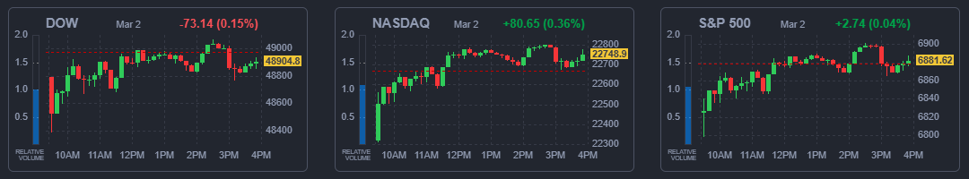 미국의 이란 공습 이후 첫 거래일인 이날 장 초반 3대 지수는 지정학적 불안정성으로 인해 일제히 1% 이상 하락했다. 다만 충격이 제한적이라는 분석과 전쟁이 조기에 종료될 수 있다는 기대감도 제기되며 소폭 반등해 보합했다.