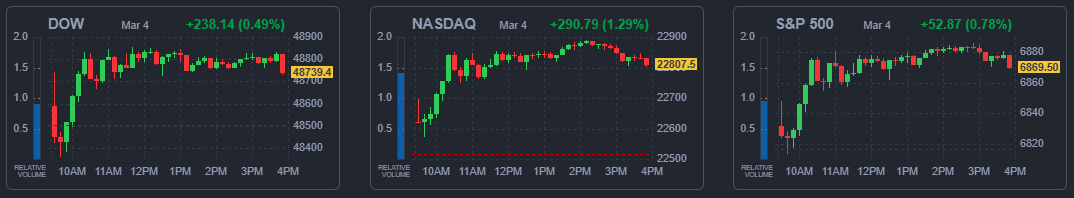 미국과 이란 간 물밑 접촉설이 돌며 분쟁이 당초 예상보다 조기에 정리될 수 있다는 기대감이 커지면서 4일(현지시간) 뉴욕 증시 3대 지수가 일제히 상승 마감했다. 특히 미국 정부의 유가 안정 조치로 원유 시장이 진정 기미를 보인 것이 영향을 줬다.