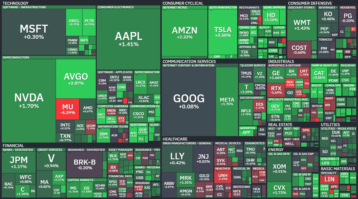 23일(미국 동부시간) 뉴욕증권거래소(NYSE)에서 다우존스30산업평균지수는 전장보다 631.00포인트(1.38%) 뛴 46,208.47에 거래를 마감했다. 스탠더드앤드푸어스(S&P) 500지수는 전장보다 74.52포인트(1.15%) 상승한 6,581.00, 나스닥종합지수는 299.15포인트(1.38%) 상승한 21,946.76에 장을 마쳤다.