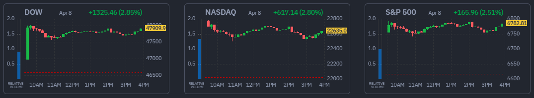 8일(현지시간) 뉴욕증권거래소에서 다우존스30산업평균지수는 전장 대비 1325.46포인트(2.85%) 오른 4만7909.92에 거래를 마쳤다. 이날 다우지수 상승폭은 지난해 4월 이후 1년 만에 최대치다.