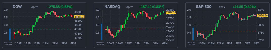 이날 홈트레이딩시스템(HTS)에 따르면 뉴욕증권거래소(NYSE)에서 다우존스30산업평균지수(다우지수)는 전 거래일보다 275.88포인트(0.58%) 오른 4만8185.80에 마감했다. 대형주 중심의 S&P500지수는 41.85포인트(0.62%) 상승한 6824.66, 기술주 중심의 나스닥지수는 187.422포인트(0.83%) 올라간 2만2822.417에 장을 마쳤다.