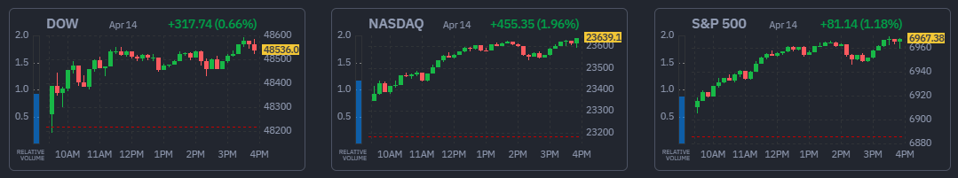 14일(현지시간) 미국의 3대 지수는 일제히 상승세로 마쳤다. 미국과 이란의 2차 종전 회담이 이틀 안에 개최될 것이라는 기대감에 국제유가도 하락하며 위험자산 선호 심리가 확대된 영향이다.