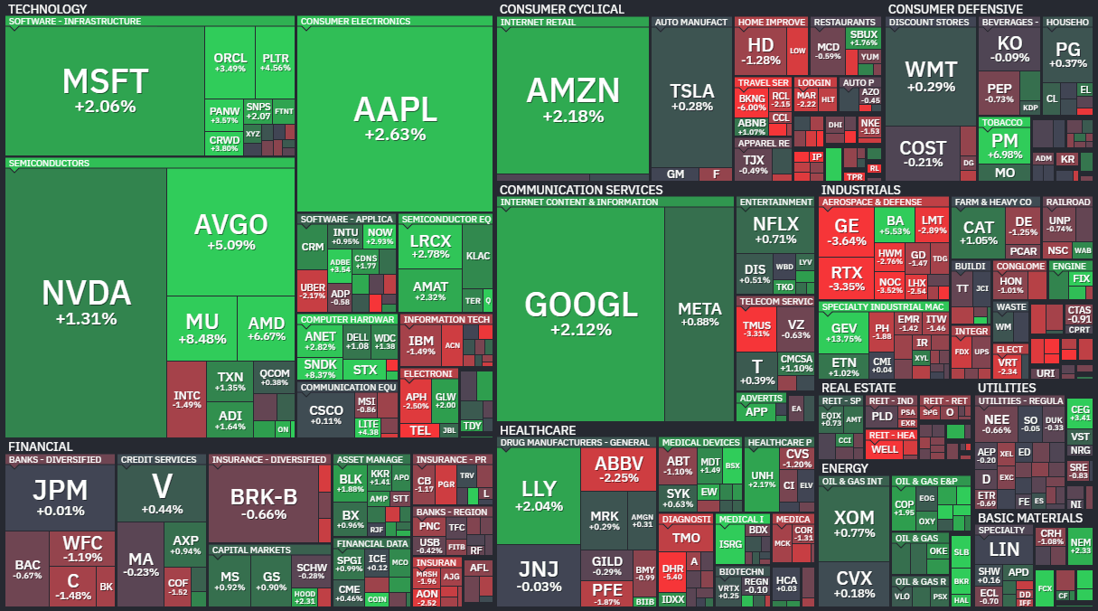 뉴욕증권거래소(NYSE)에서 다우존스30산업평균지수(다우지수)는 전 거래일보다 340.65포인트(0.69%) 오른 4만9490.03에 마무리했다. 대형주 중심의 S&P500지수는 73.89포인트(1.05%) 상승한 7137.90, 기술주 중심의 나스닥지수는 397.603포인트(1.64%) 상승한 2만4657.567에 장을 마쳤다.
