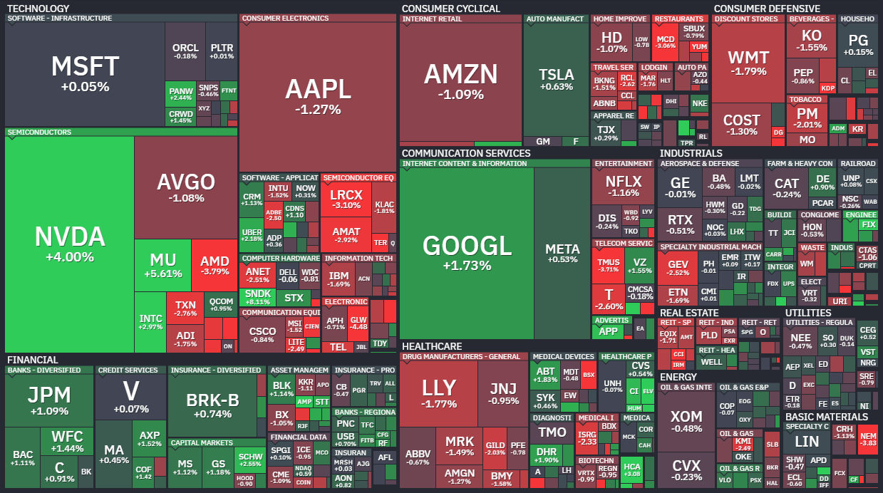 30개 대형 우량주로 구성된 다우존스30 산업평균지수는 전 거래일보다 62.92포인트(-0.13%) 내린 49,167.79에 마감했다.